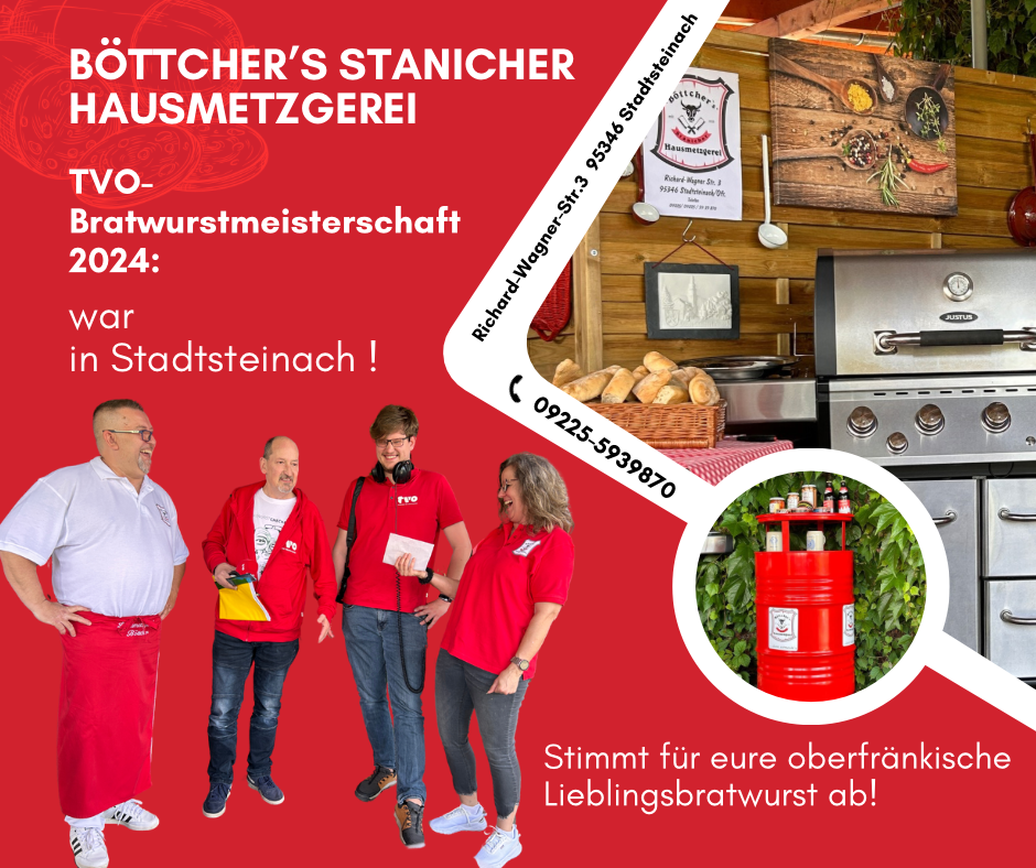 2024 hatten wir die Ehre, die Kulmbacher Bratwurst und somit die Region und den Landkreis Kulmbach, bei der Bratwurstmeisterschaft von TV-Oberfranken zu repräsentieren. Unsere Kulmbacher Bratwurst (welche eigentlich eine Stanicher Bratwurst ist), musste gegen die Coburger, die Hofer, die Pegnitzer und die Bamberger Bratwürste antreten.